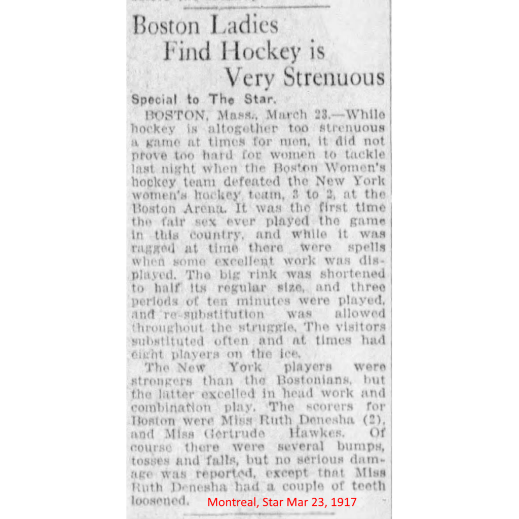 This time, it was a piece from the Montreal Star, March 23, 1917, describing a women’s hockey game between Boston and New York at the old Boston Arena. The reporter confidently calls it “the first women’s hockey game ever held in the United States” — which, despite what it says, isn’t actually true — but that confidence is part of the charm. You can feel the writer discovering the women’s game in real time and being bowled over by it.